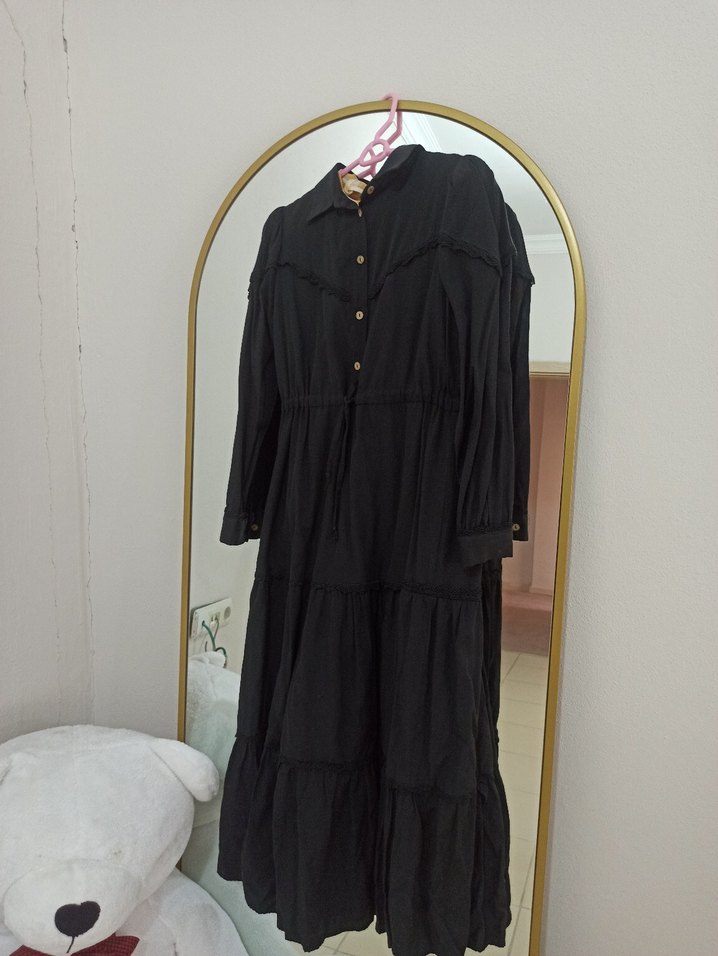 Siyah uzun pamuklu elbise, bol kesim, uzun kollu ve yaka detayıyla. Nakışlı desenler ve fırfır detaylarıyla gotik ve bohem tarzda. giyilmedi