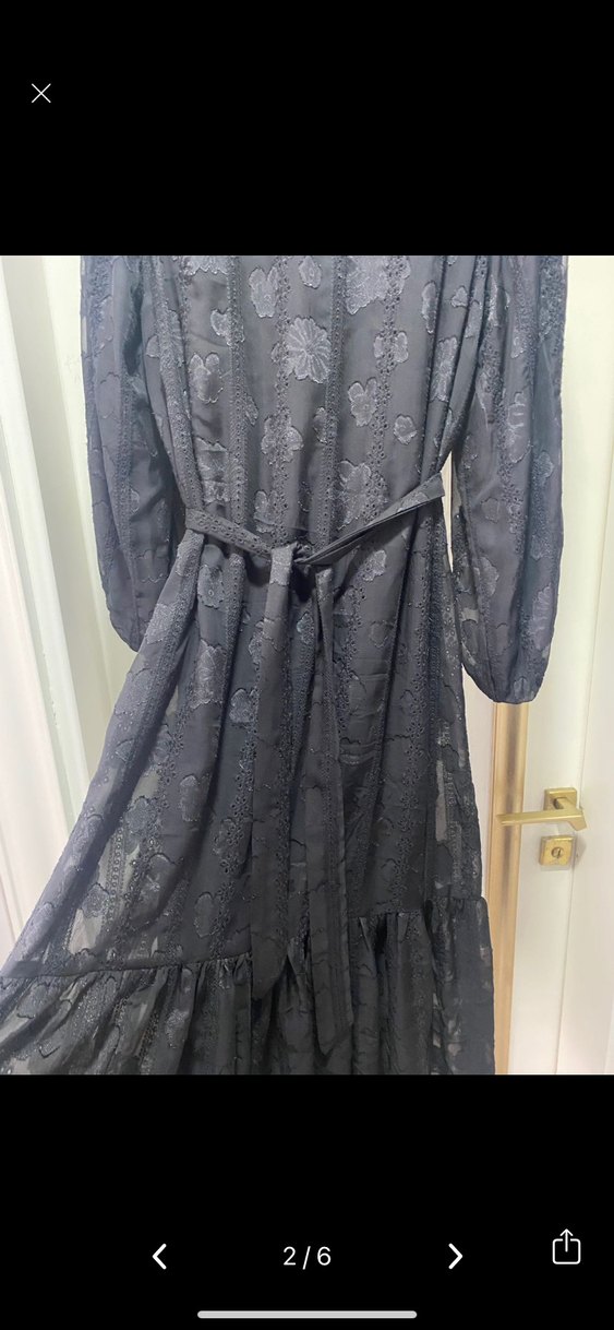 Nakışlı çiçek desenleri, bol kesim ve fırfır detaylarıyla siyah uzun elbise. İnce askılı kolları ve yüksek yakası günlük kullanım için uygundur.