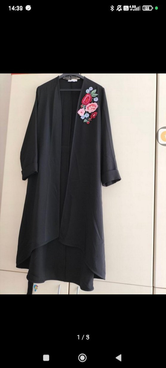 Siyah uzun, salaş kesim kimono; yakasında çentikli yaka, uzun kollu, göğüs kısmında renkli çiçek nakışı ve dökümlü detaylara sahiptir. Minimalist ve bohem tarzı yansıtır.