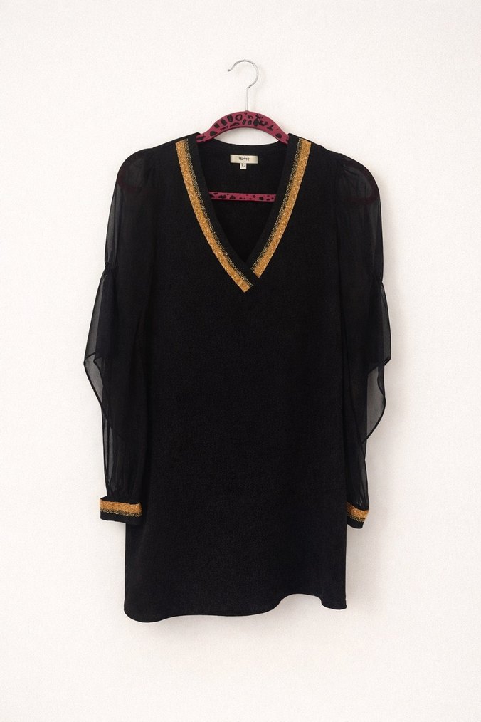 Koton marka siyah şifon kollu elbise Hafif ve dökümlü kumaşı sayesinde rahat ve şık bir duruşu vardır. V yaka kısmındaki gold şerit detayları modele zarif bir hava katar. Günlük kullanımda, ofiste veya akşam kombinlerinde rahatlıkla tercih edilebilir.