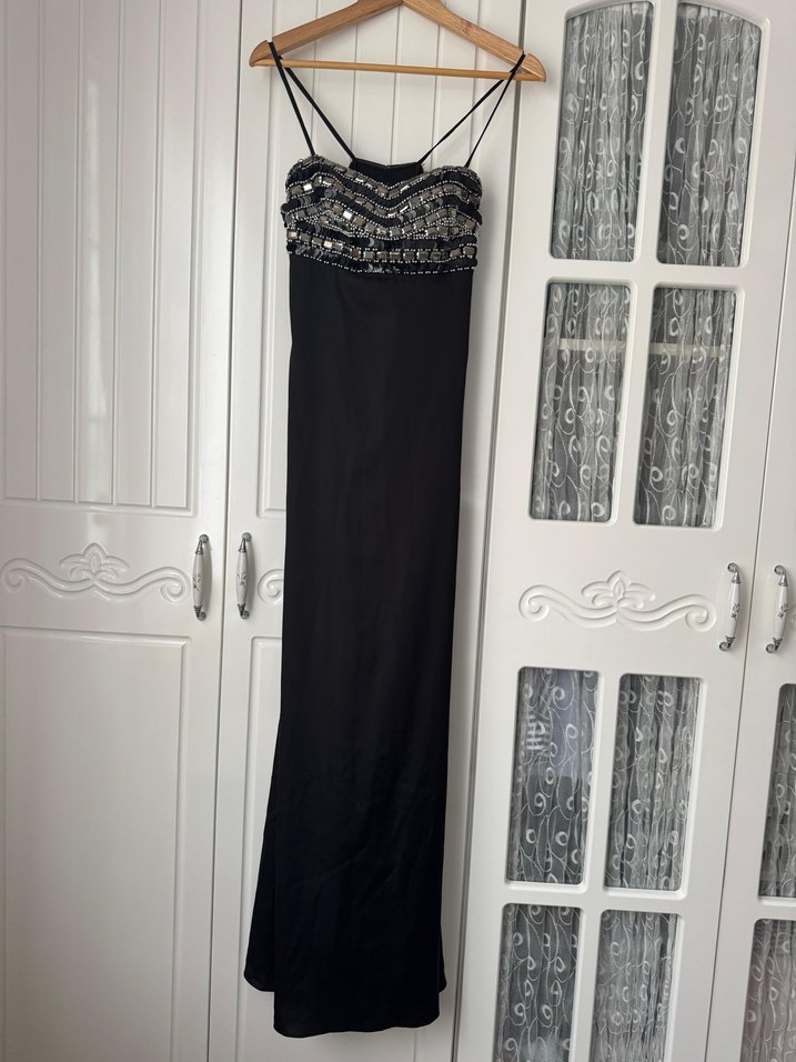Nakış işlemeli, straplez yaka ve drapeli ince askılı, siyah uzun elbise, romantik akşamlar için uygundur. Bedem daraltması olmuştur S beden içim uygundur. Askı eklenmiştir. İsterseniz askıları çıkarttırabilirsiniz.