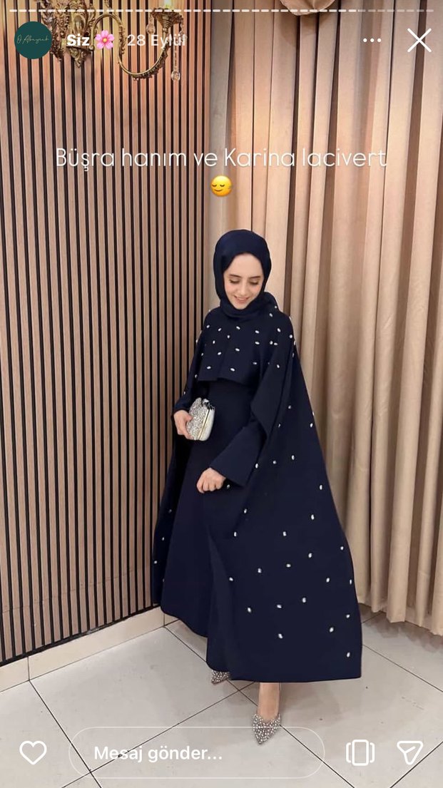 Siyah renkte, yüksek yakalı ve uzun kollu, nakış detaylı ve drapeli uzun tesettür elbise. Minimalist ve sade tasarımıyla günlük kullanıma uygun.