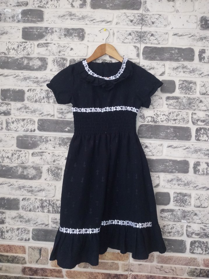 Siyah, nakışlı ve fırfırlı detaylara sahip, kısa kollu, tekne yakalı, vintage tarzda uzun ve dar kesim elbise.
