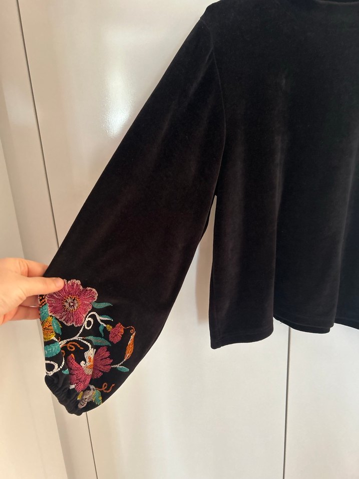 Siyah renkte, yüksek yakalı ve uzun kollu bluz. Kollarında renkli çiçek nakışları ve düğmeli detaylar bulunur. Gevşek kesim ve midi boydadır.