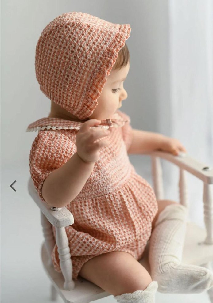 Nakışlı detaylara sahip somon rengi kız bebek tulumu, yumuşak dokulu ve uyumlu şapkalı rahat bir tasarım. 10 dakika fotoğraf çekimi için kullanıldı 3.06 ay fakat kalıp geniştir.