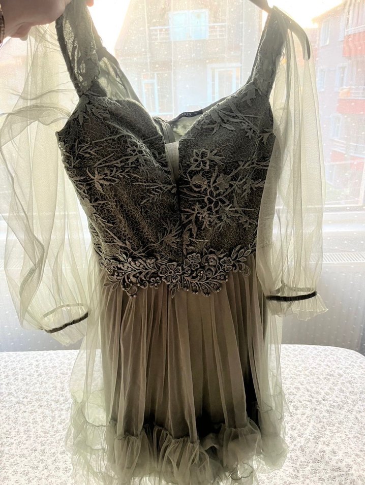 Nakışlı detaylara ve strappy kollara sahip, drapeli, straplez yakalı, gri-bej tonlarında vintage midi elbise. Düğünler için uygun.