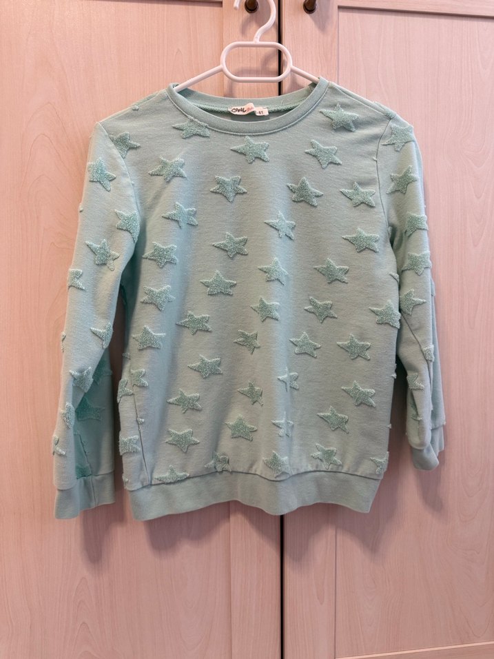 Uzun kollu, yuvarlak yakalı, gevşek kesim kız sweatshirtü, yumuşak pastel mavi kumaş üzerinde nakışlı yıldız detaylarına sahiptir. Rahat ve günlük bir tarzdadır.