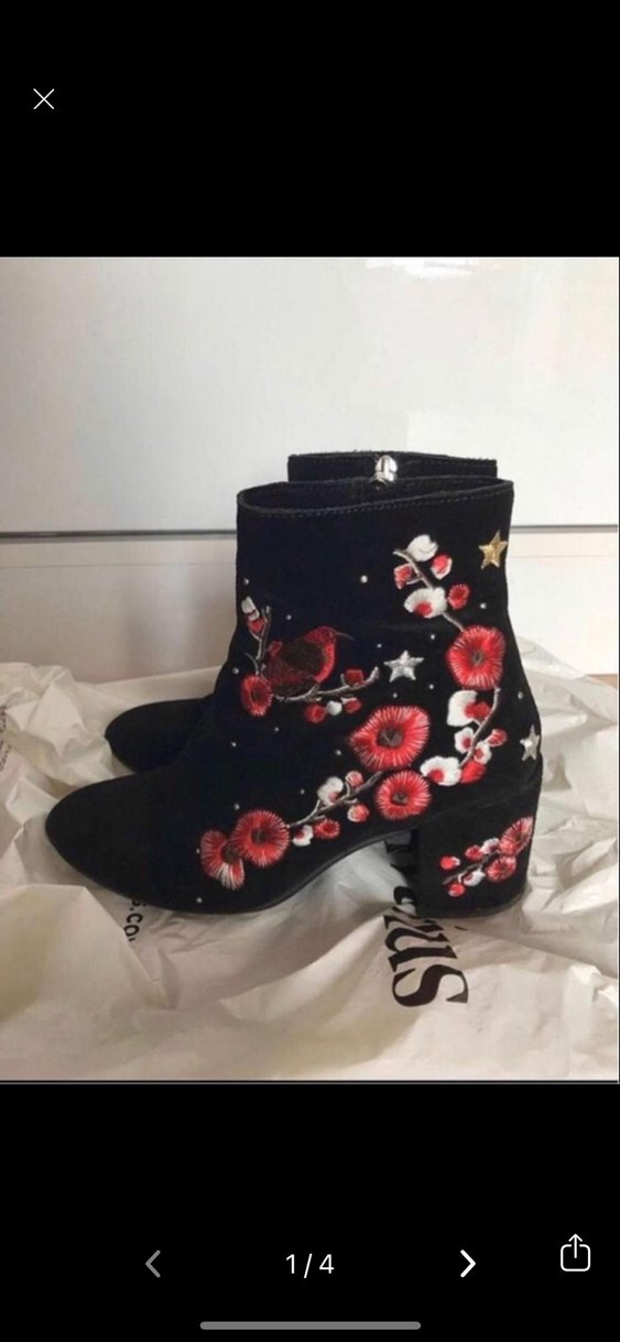 Nakışlı çiçek ve kuş desenli koyu süet kadın botları, kalın topuklu ve tokalı, romantik akşamlar için uygun.