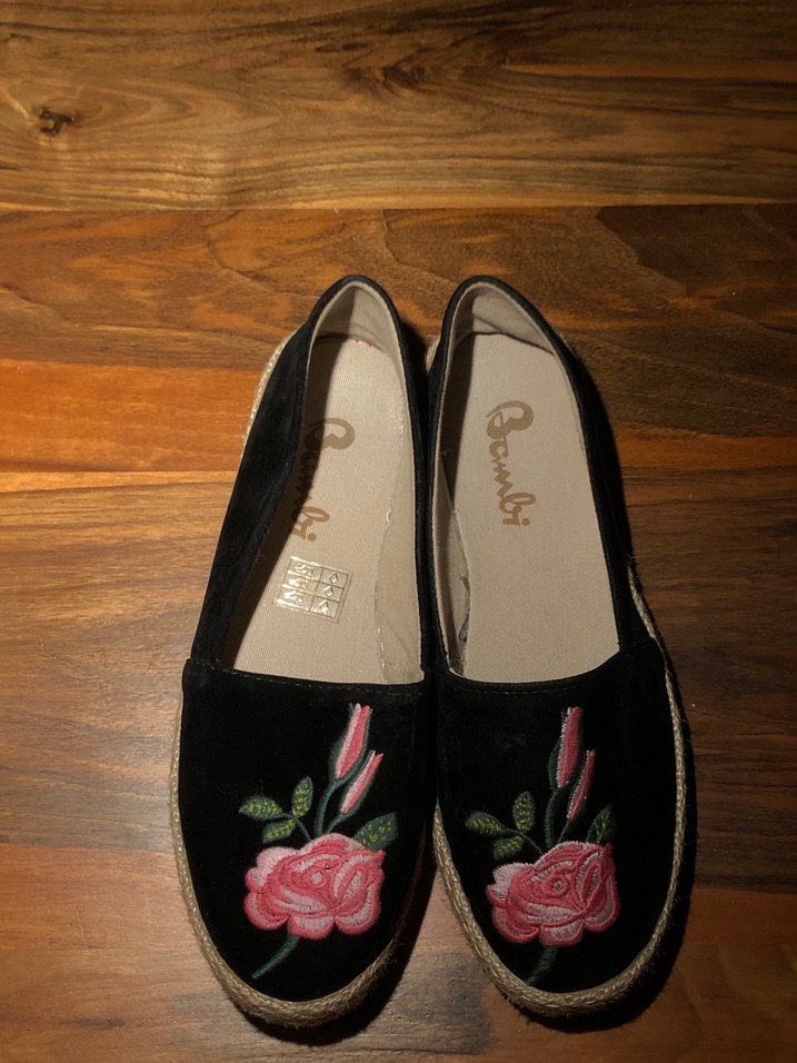 Siyah renkli, gül deseni nakışlı bohem bir espadril. Bir kere giyildi ve rahat, şık bir ayakkabı.