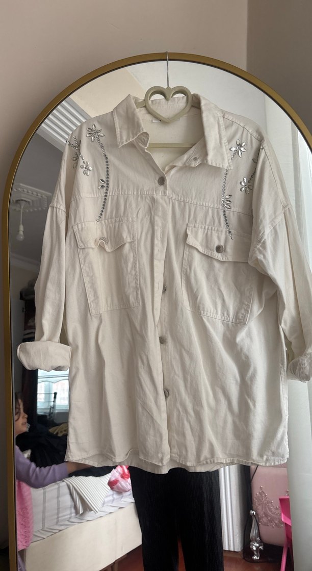 Nakışlı taşlı Beyaz Kadın Keten Gömlek ceket