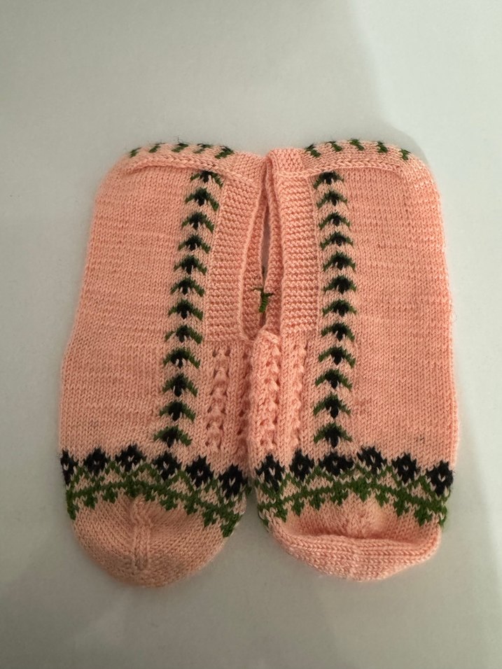 Yeşil ve siyah nakış detaylı, pastel pembe kız çorabı. Yumuşak ve rahat örme kumaştan üretilmiştir.