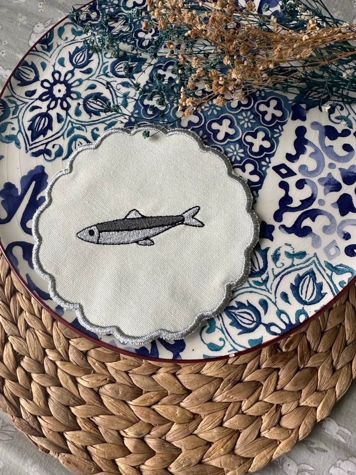 Nakışlı balık desenli, kenarları dalgalı bohem tarzda gümüş iplik istenilen desen işlenir toplu sipariş alınır