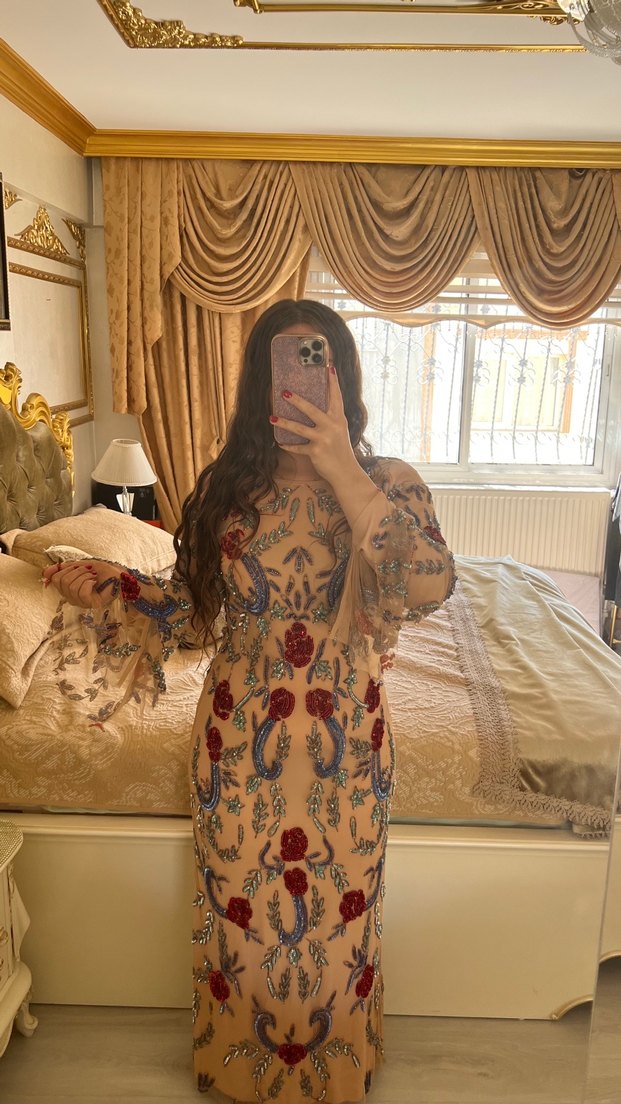 Bej renkli, uzun kollu, transparan kumaşlı, nakış detaylı bohem tarzda fitted elbise. Romantik akşamlar için uygun.