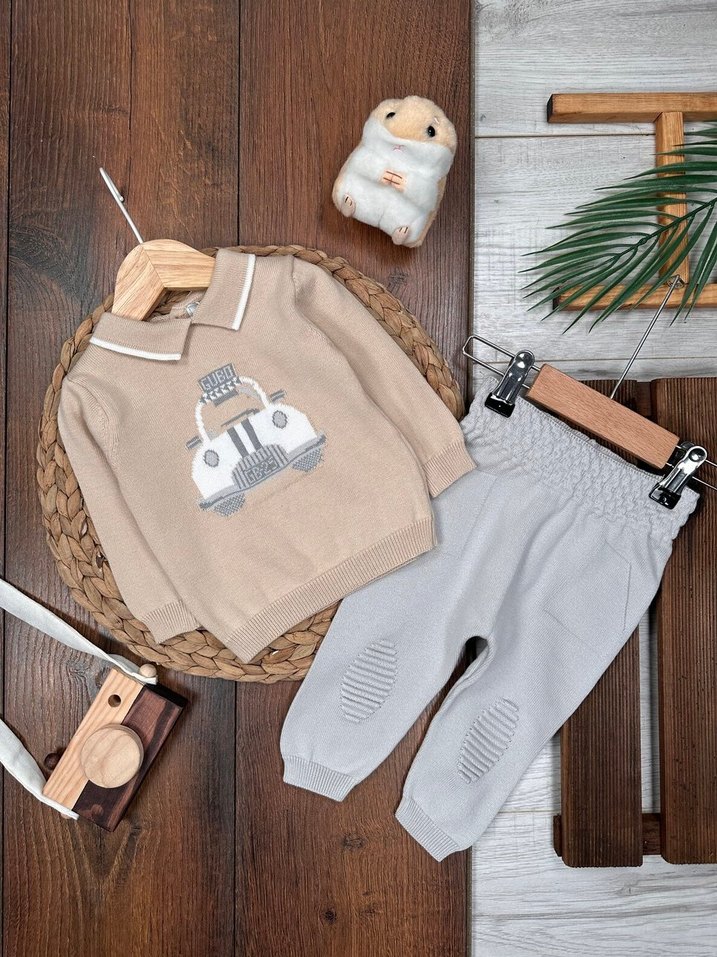 Nakışlı araba desenli, bej renkli triko uzun kollu üst ve diz detaylı gri triko pantolondan oluşan bebek erkek takım.