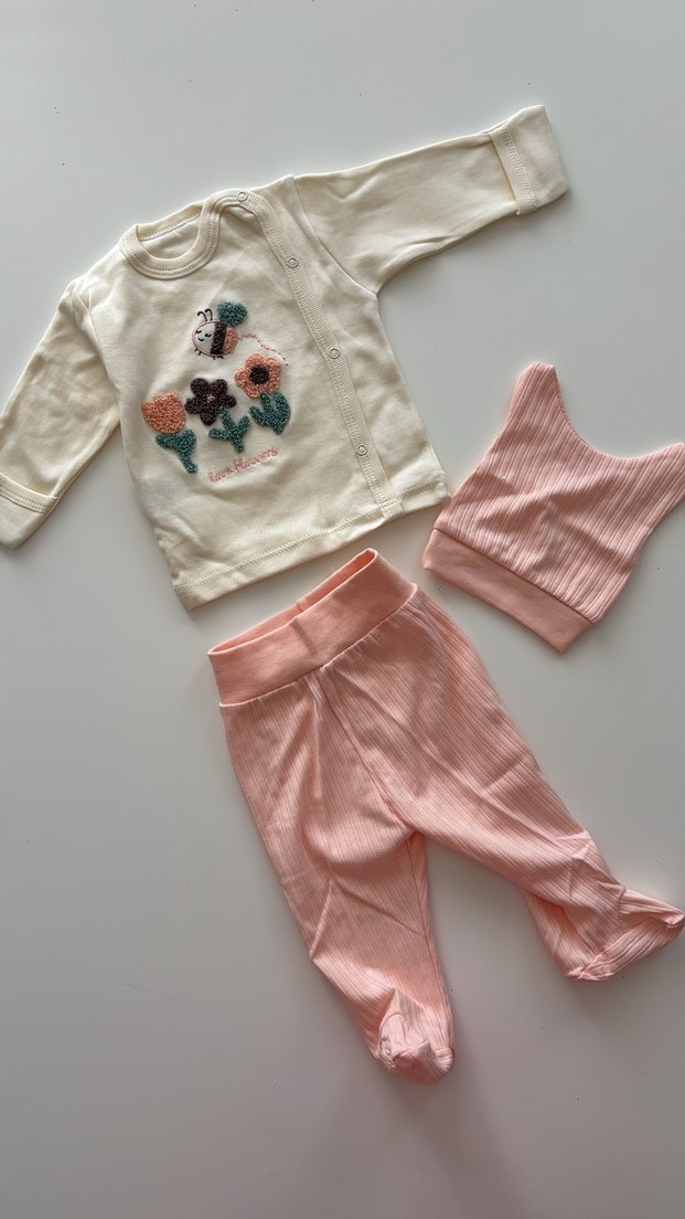Nakışlı çiçek detaylı uzun kollu triko üst, pastel pembe triko pantolon ve uyumlu triko kolsuz yelekten oluşan bebek kız takımı. Gizli eldiven detay