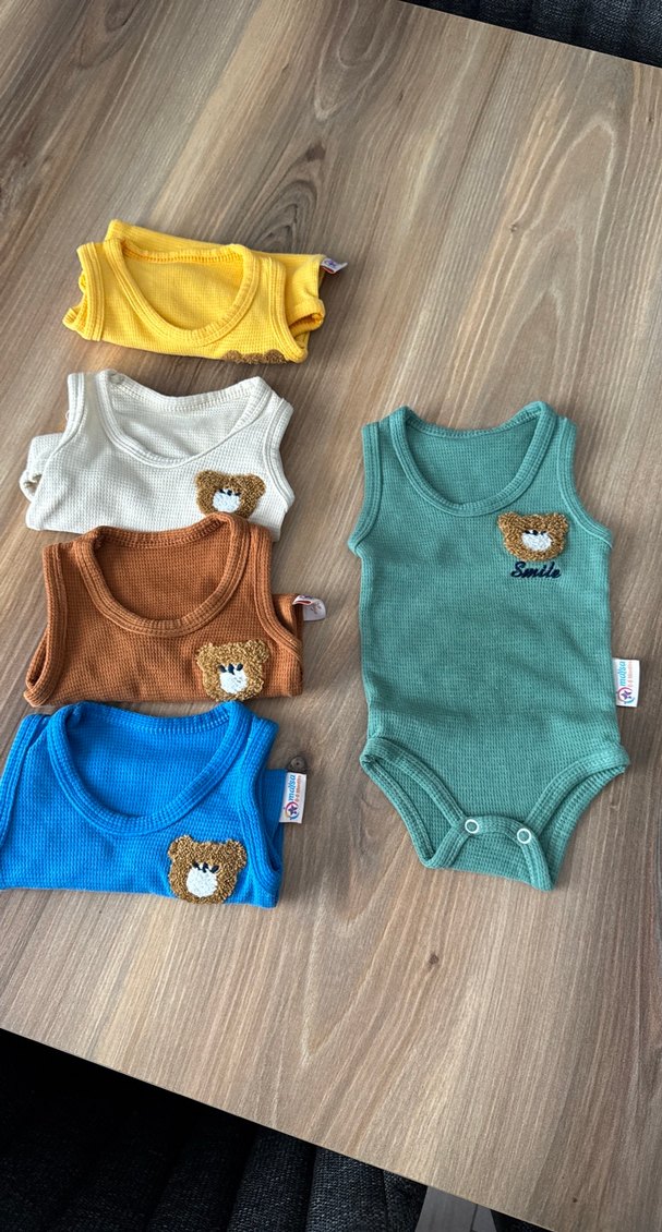 0/3 ay için Triko kumaştan, kolsuz, bisiklet yaka erkek bebek body. Nakışlı ayı detayı ve pastel renkler bulunur. Normcore tarzda rahat bir model. Yıkandı giyilmedi