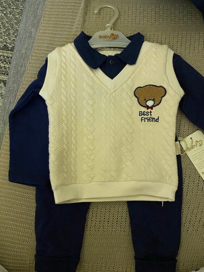 Nakışlı ayıcık desenli beyaz triko süveter, lacivert uzun kollu üst ve pantolonlu yumuşak ve sıcak kumaş bebek takımı.