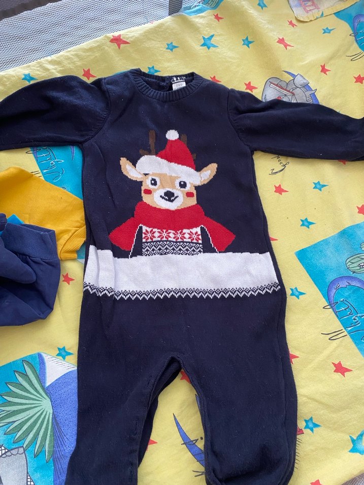 Yumuşak kumaştan, nakışlı geyik desenli, triko örme koyu gri bebek tulumu, sokak stili için uygun.