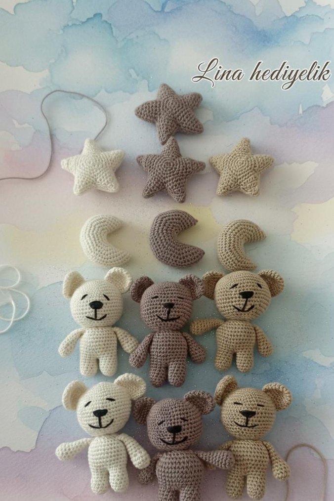Nakışlı bej ve gri triko yıldız, ay ve ayı figürlü bebek uyku aksesuarları. Yumuşak ve rahat tasarım.