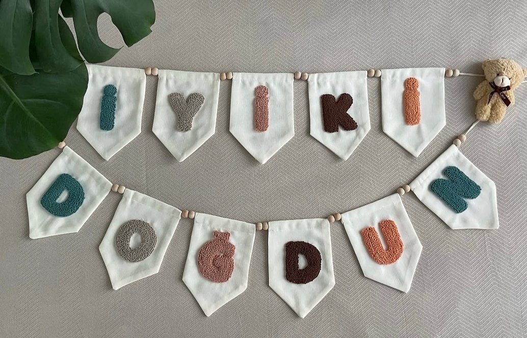 Nakışlı harflerden oluşan, kahverengi ve gri tonlarında çocuk aksesuarıdır. Adet fiyatıdır.Uzun harfler olduğu için fiyat uygundur