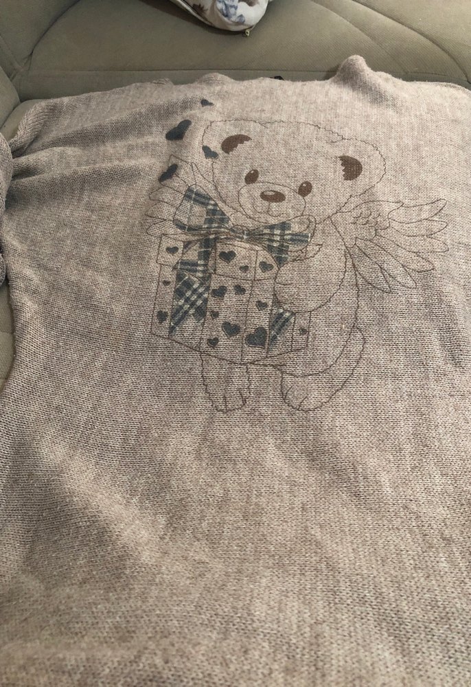 Gri ve kahverengi tonlarda, yumuşak triko kumaştan, uzun kollu, nakışlı ayıcık desenli bol kesim hamile tişörtü.