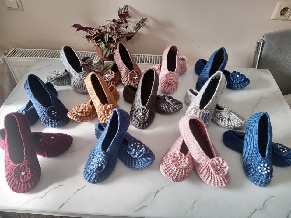 Nakışlı detaylara sahip triko kumaştan yapılmış, blok topuklu kadın ev terlikleri. Gri tonlarında, rahat ve geleneksel tasarımda.