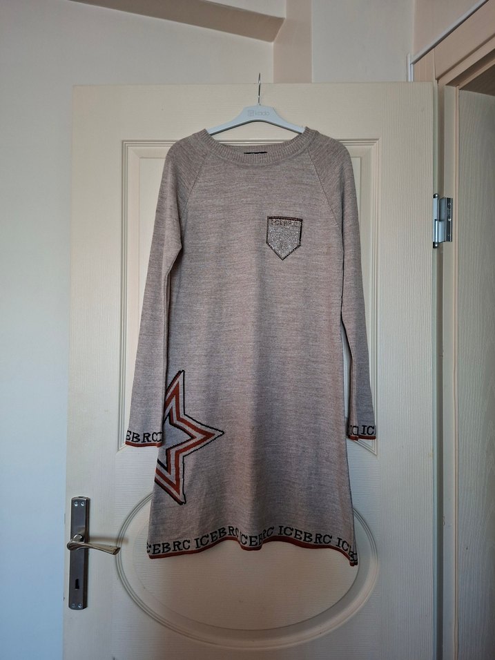 Gri renkli, uzun kollu, yuvarlak yakalı ve bol kesim triko elbise. Nakışlı yıldız ve yazı detaylarıyla rahat ve şık bir günlük sokak stili sunar. ürün sıfırdır hiç kullanılmamıştır iki koltuk altı 45 cm omuzdan aşağıya boyu 90 cm dir