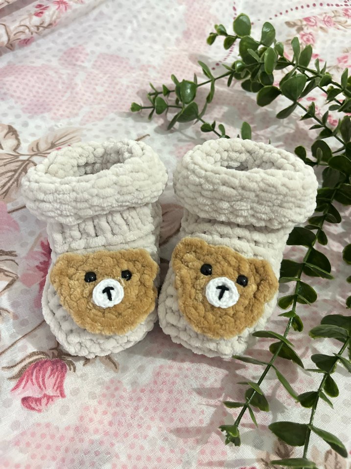 Bej renkte, yumuşak triko kumaştan yapılmış kız çocuk ev terlikleri, nakışlı ayıcık yüzleriyle sıcak ve sade bir stil sunar.