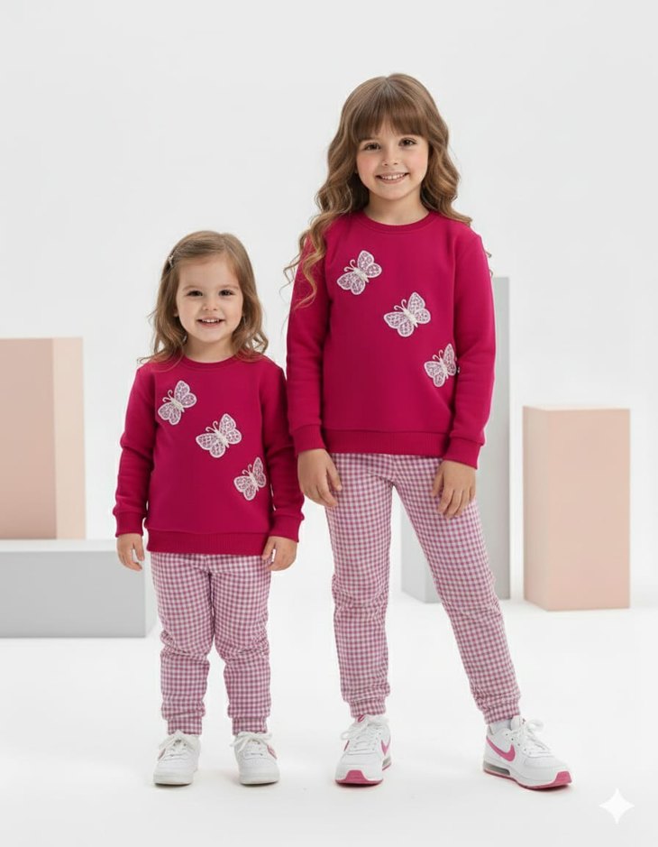 Bu bol kesim kız eşofman takımı, yuvarlak yaka ve uzun kolludur. Yumuşak kumaştan yapılmış, renkli nakışlı kelebek desenleri ve triko detaylarıyla rahat ve şık bir görünüm sunar.