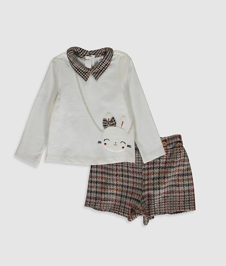 Uzun kollu, nakışlı triko üst ve ekose desenli kısa şortlu bebek kız takımı. Üstte sevimli tavşan figürü bulunur. Beyaz ve kahve tonlarındadır. Lc waikiki marka etiketini kesmişim ama 24-36 ay bedenli sevimli şortlu takım.Üstü yakalı arkadan düğmelidir altı ise arkadan lastiklidir son fotoda elimle gösterdiğim yerde çok hafif belli belirsiz bir lekesi var onun dışında iyi durumdadır