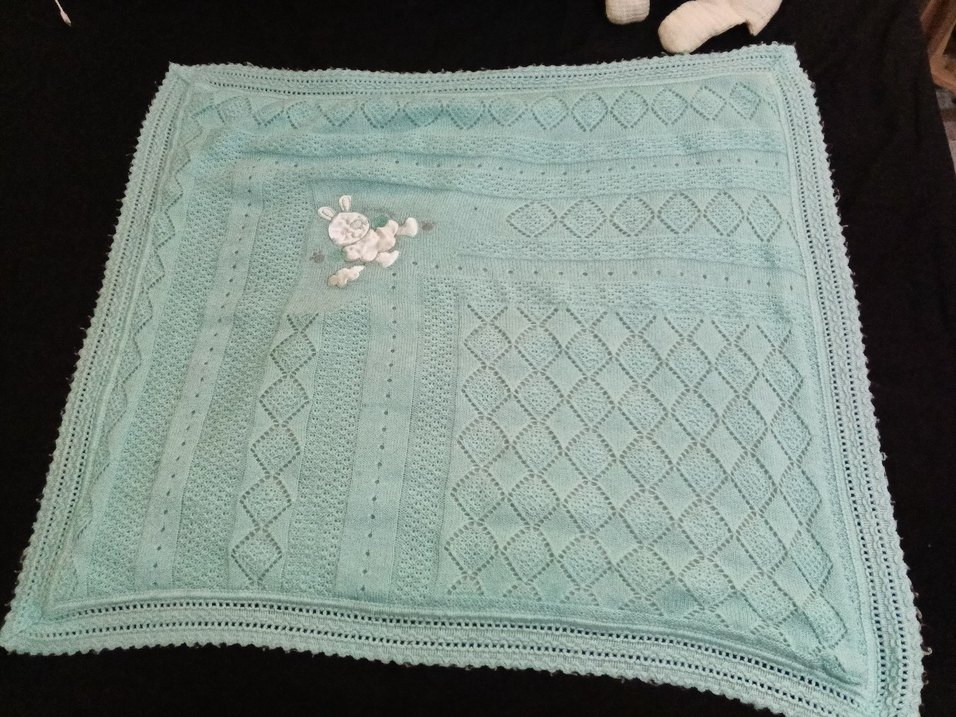 Pastel turkuaz renkte, yumuşak örme kumaştan yapılmış, nakışlı detaylara sahip bebek battaniyesi.