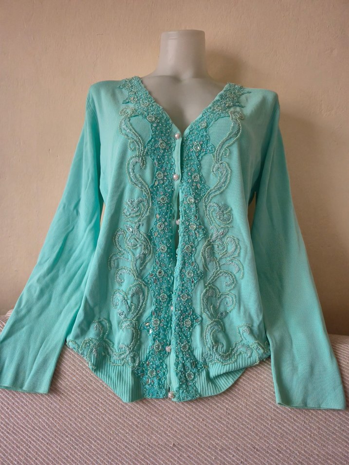 Turkuaz bohem tarzda, uzun kollu ve V yakalı, nakışlı detaylara sahip düğmeli hırka. Rahat kesimli, yumuşak triko kumaştan günlük kullanım için uygundur.