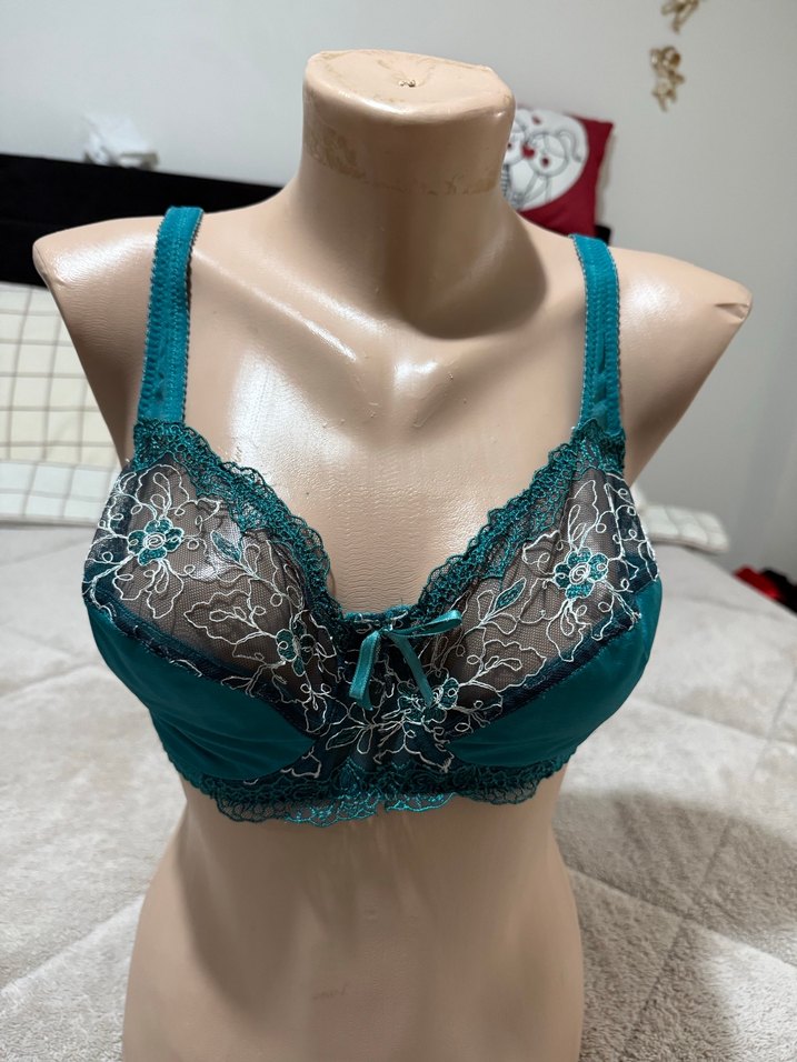 Turkuaz renkte, nakışlı ve bohem Paris tarzında, normal uzunlukta bir sütyen. Koyu ve canlı renk detayları bulunur.
