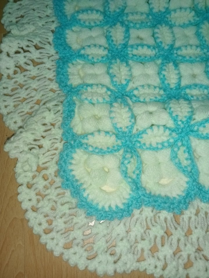 Nakışlı Turkuaz Çocuk Örtüsü Nakışlı desenlere sahip pastel turkuaz renkli örgü çocuk örtüsü, yumuşak ve rahat dokudur. Çocuklar için uygundur. El emegidir hazır değildir.