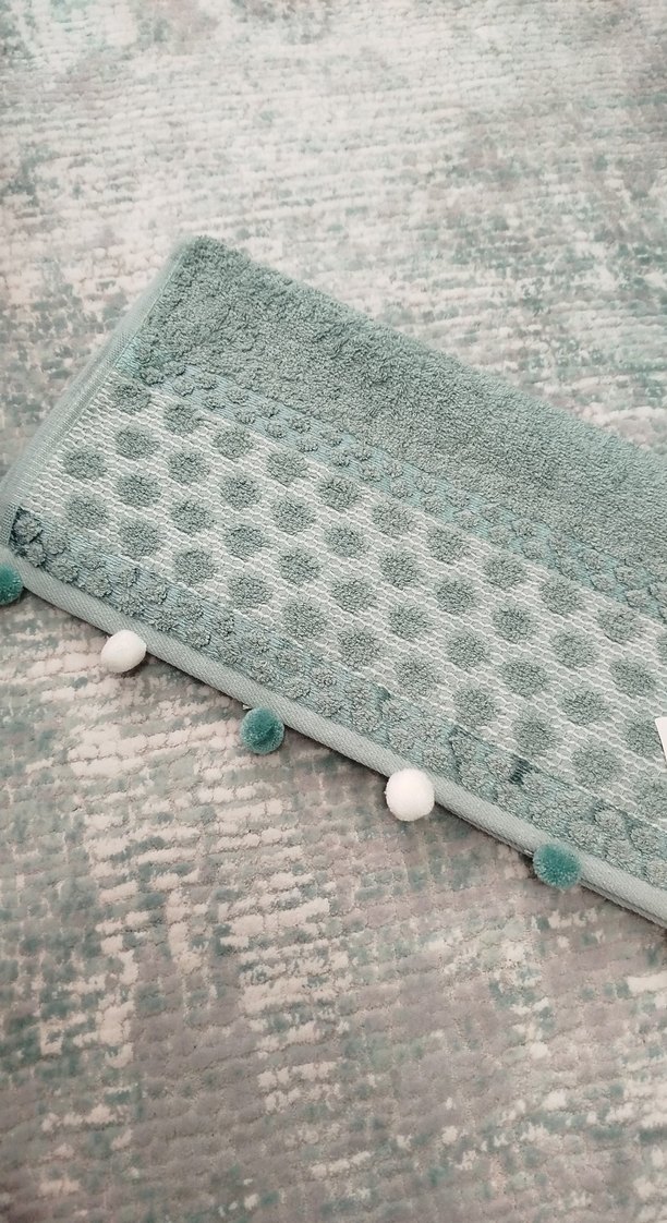 Pastel turkuaz renkte, nakışlı desenlere sahip ve kenarında ponpon detayları bulunan yumuşak banyo paspası.