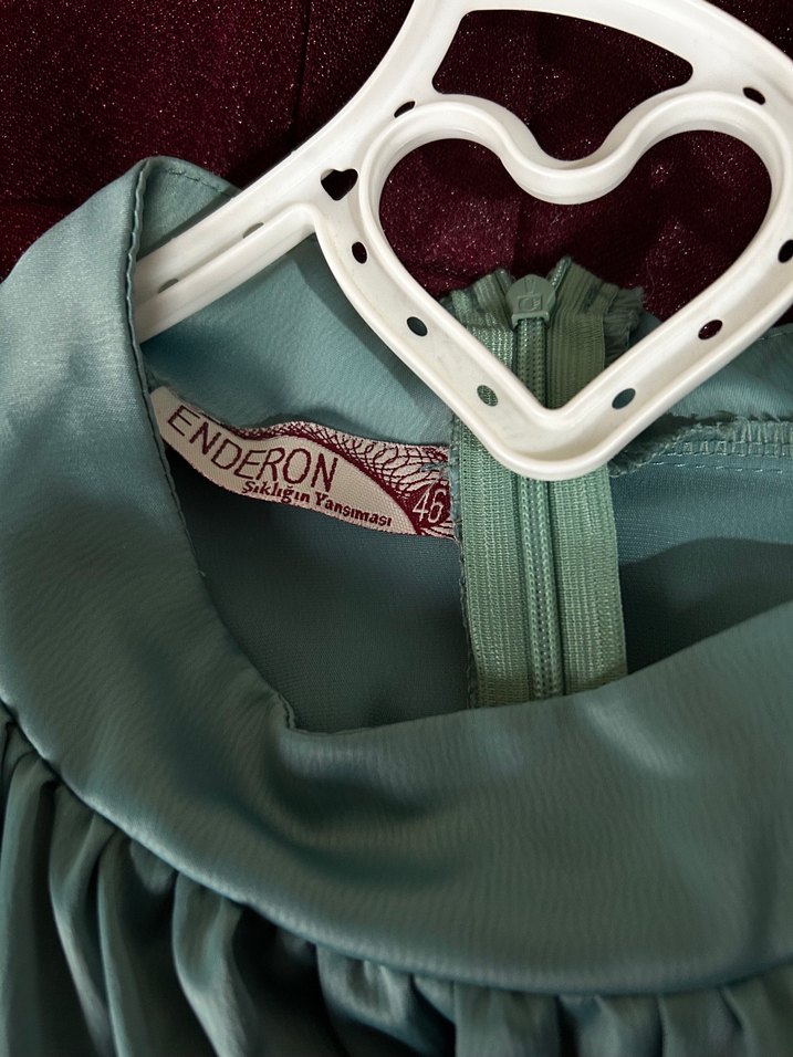 Nakışlı desenli, ince askılı ve halter yakalı, turkuaz renkte, . Satenimsi kumaş ve fermuarlı arkasıyla bohem vintage tarzı sunar.