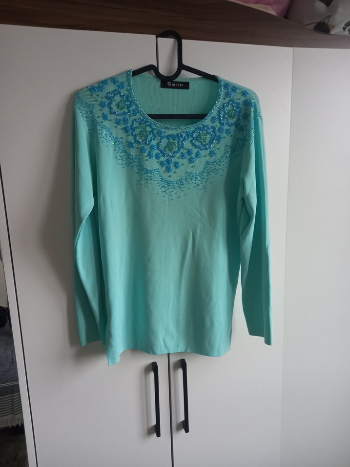 Nakışlı çiçek desenleriyle turkuaz triko, uzun kollu ve yuvarlak yakalıdır. Normal midi boyda, bol kesimdir ve günlük bohem tarzına uygundur.