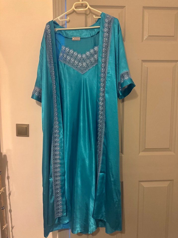 Uzun ve bol kesim kadın gecelik, kısa kollu ve parlak turkuaz renkte, nakış detaylarıyla süslenmiştir. 3 parçadır.