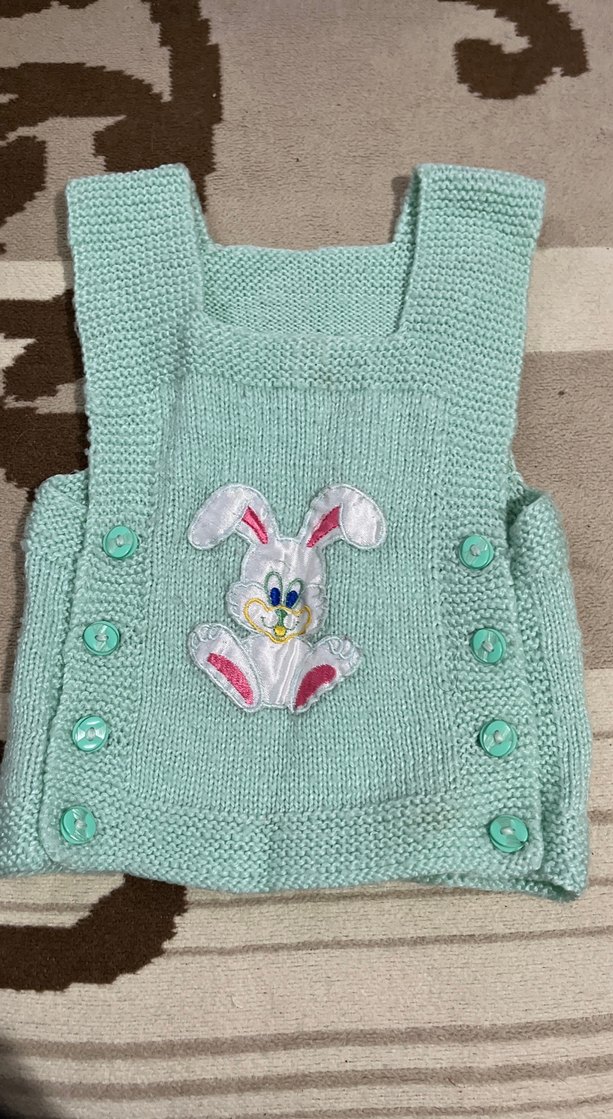 Fitted kesimde, turkuaz renkli triko kız çocuk yeleği, kolsuz ve bisiklet yaka. Nakışlı tavşan deseni ve yanlarda düğme detayları bulunur.