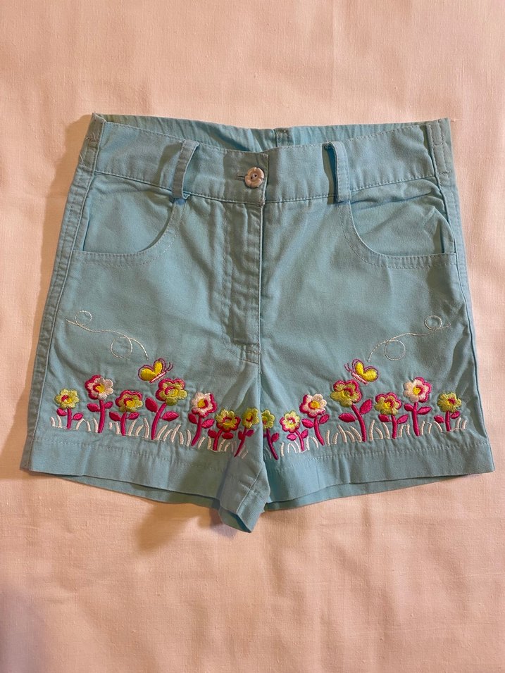 Turkuaz keten kumaştan düğmeli ve bol kesim kız şortu, etek ucunda renkli çiçek nakışlarıyla bohem tarzını yansıtıyor. Bel lastiği deforme olarak kumaşa biraz renk vermiştir, başka sorunu yoktur. Ölçüleri fotolarda mevcuttur.