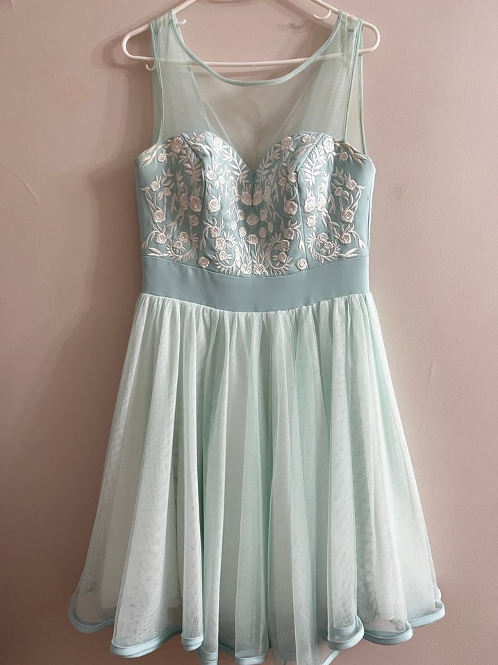 Nakışlı dantel işlemeli, straplez yakalı ve midi boy, turkuaz renkli klasik şıklıkta abiye elbise.