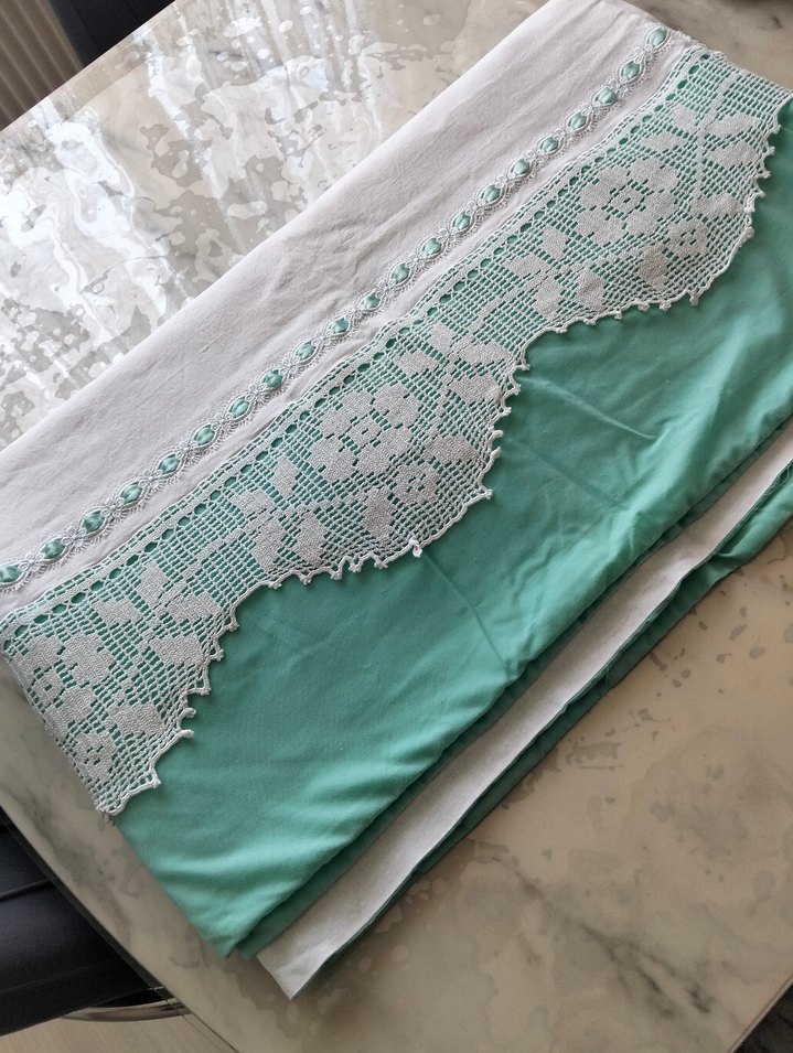 Pastel turkuaz renkte, kenarlarında beyaz nakış detayları bulunan nevresim ve çarşaf takımıdır. ️