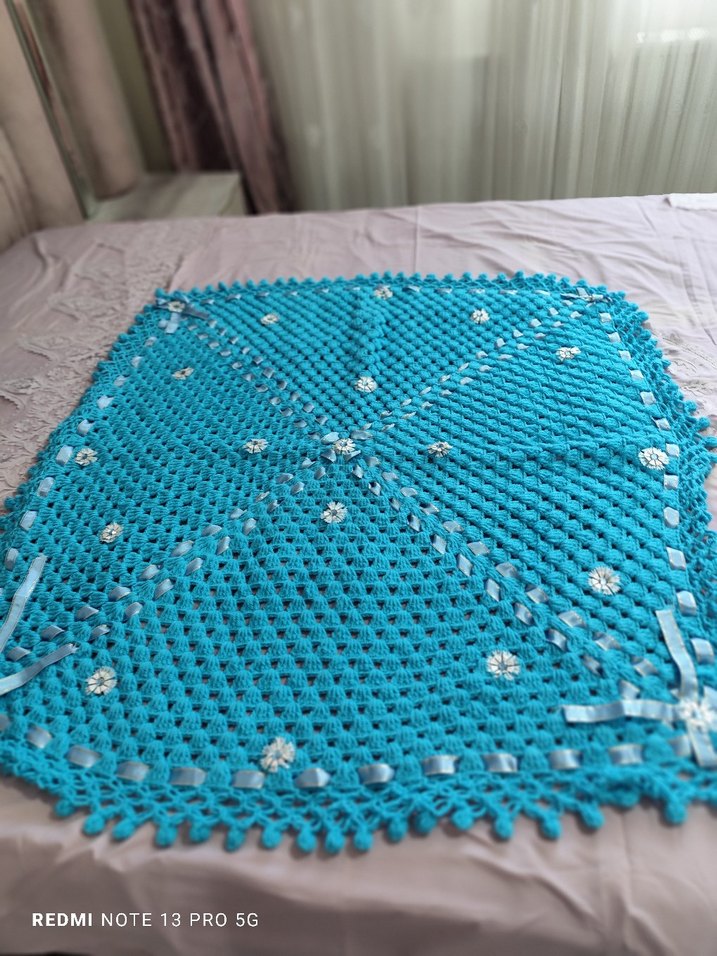 Turkuaz renkli, nakışlı çiçek desenleri ve kurdele detayları olan örgü çocuk battaniyesi. Yumuşak ve rahat bir kullanım sunar. Hiç kullanılmadı yenidir... Taşınma durumum olduğu için satıyorum