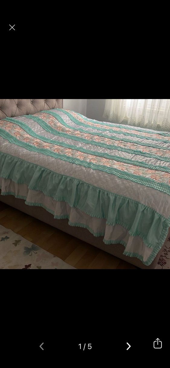 Nakışlı desenlere sahip, pastel turkuaz renklerde, fırfırlı kenarlarıyla yatak odasına zarif bir dokunuş katan yatak örtüsü. ️ ufak lekeleri var belli olmıyor net