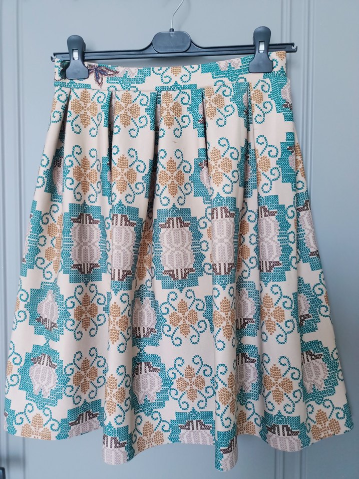 Nakışlı desenlere ve pilelere sahip turkuaz midi etek, bol kesimi ve bohem tarzıyla günlük kullanıma uygundur. Pastel tonlarda şık bir seçim.