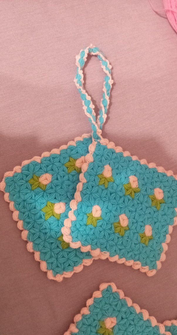 Renkli nakışlı çiçek desenleri ve askısı olan turkuaz fırın eldivenleri. Yumuşak dokulu kumaş ısı koruması sağlar.