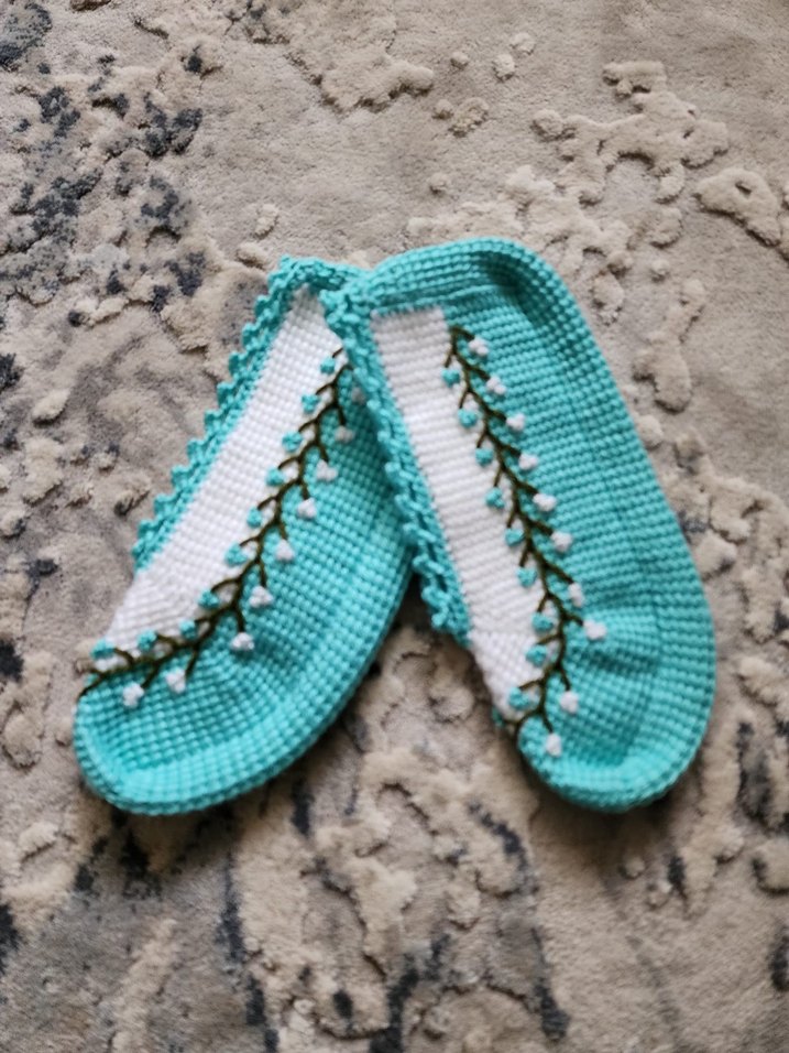 Kadınlar için nakışlı, triko örme turkuaz ev terlikleri. Rahat, bohem tarzda, günlük kullanım için uygundur. Yumuşak örme kumaştan yapılmıştır.
