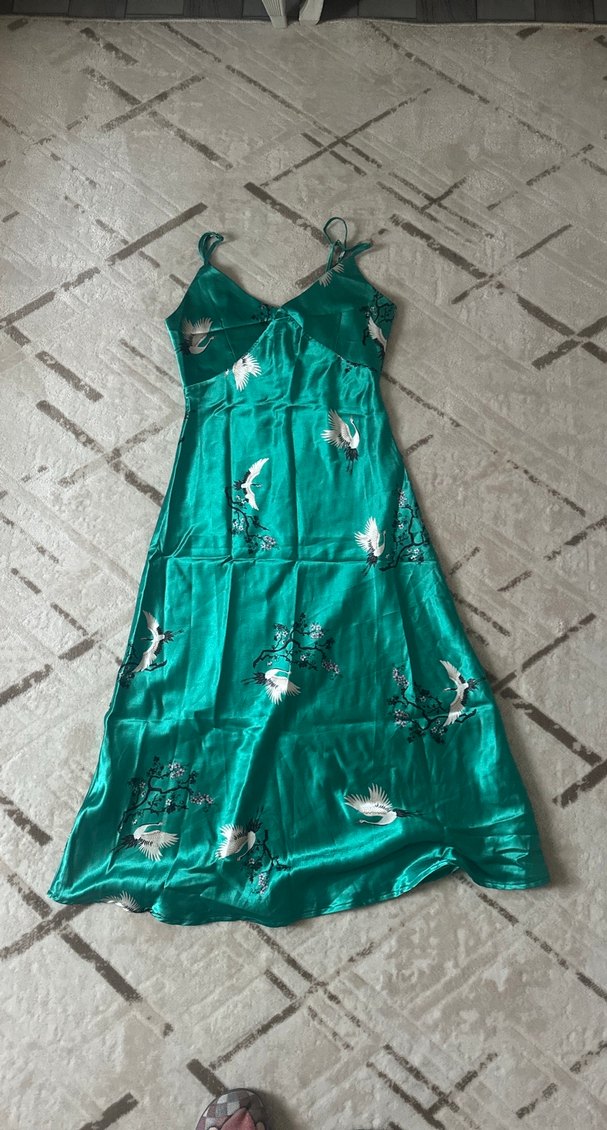 Nakışlı desenlere sahip, straplez turkuaz uzun elbise, drapeli ve dar kesimdir. Parlak kumaşıyla romantik akşamlar için bohem vintage tarzını yansıtır.