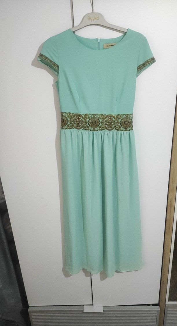 Turkuaz uzun kadın elbise, kısa kollu, yuvarlak yakalı ve nakışlı kemer detaylıdır. Pastel tonu ve vintage stiliyle düğünlere uygundur.