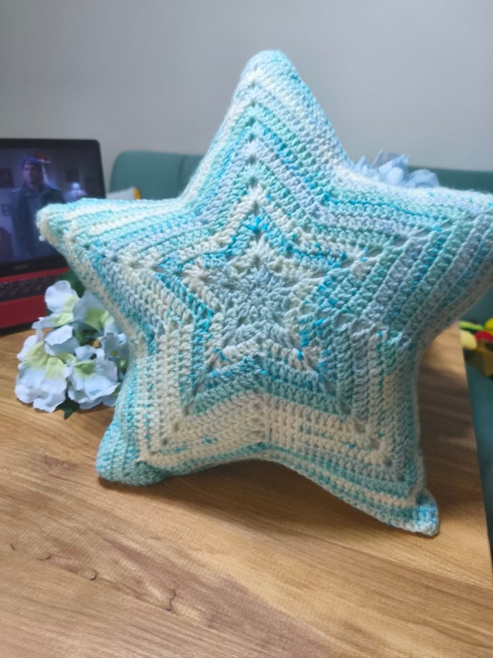 Nakışlı detaylara sahip pastel turkuaz yıldız şeklinde bohem tarzda yastık. Dekoratif kullanım için yumuşak dokulu. amigurumi el örgüsüdür battaniye koltuk örtüsü TV battaniyesi takım olarak gönderilir